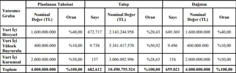 Yurt içi kişisel yatırımcılardan en son tahsisatın 1,34 katı, yüksek başvurulu yatırımcılardan 13,35 katı, kurumsal yatırımcılardan ise 1,5 katı oranında talep geldi.