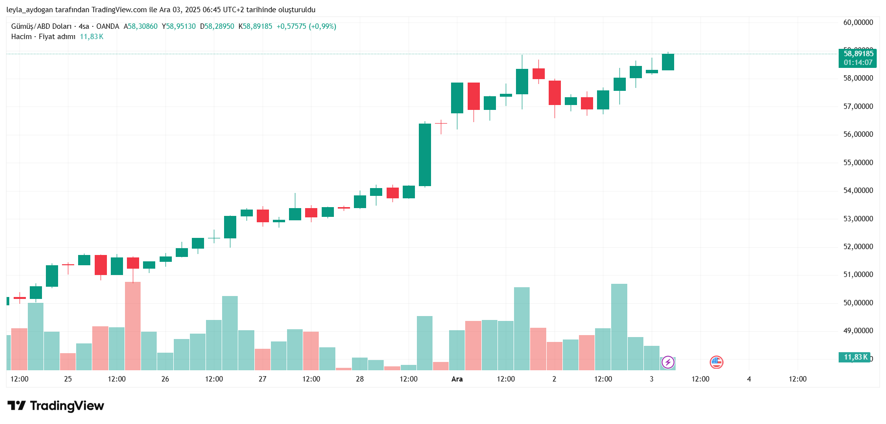 Gümüş fiyatları, yatırımcıların Fed’in daha gevşek bir para politikasına yönelmesini fiyatlaması ve arz tarafındaki sıkışıklığın sürmesiyle rekor seviyeye yaklaştı. Değerli metal, salı günü yüzde 2,4’e varan düşüşün ardından yüzde 1,1 yükselerek önceki gün görülen 58,84 dolarlık tarihi zirveye yeniden yaklaştı. Gümüş, bu yıl neredeyse ikiye katlanan performansıyla 1979’dan bu yana en güçlü yıllık yükselişine ilerliyor.