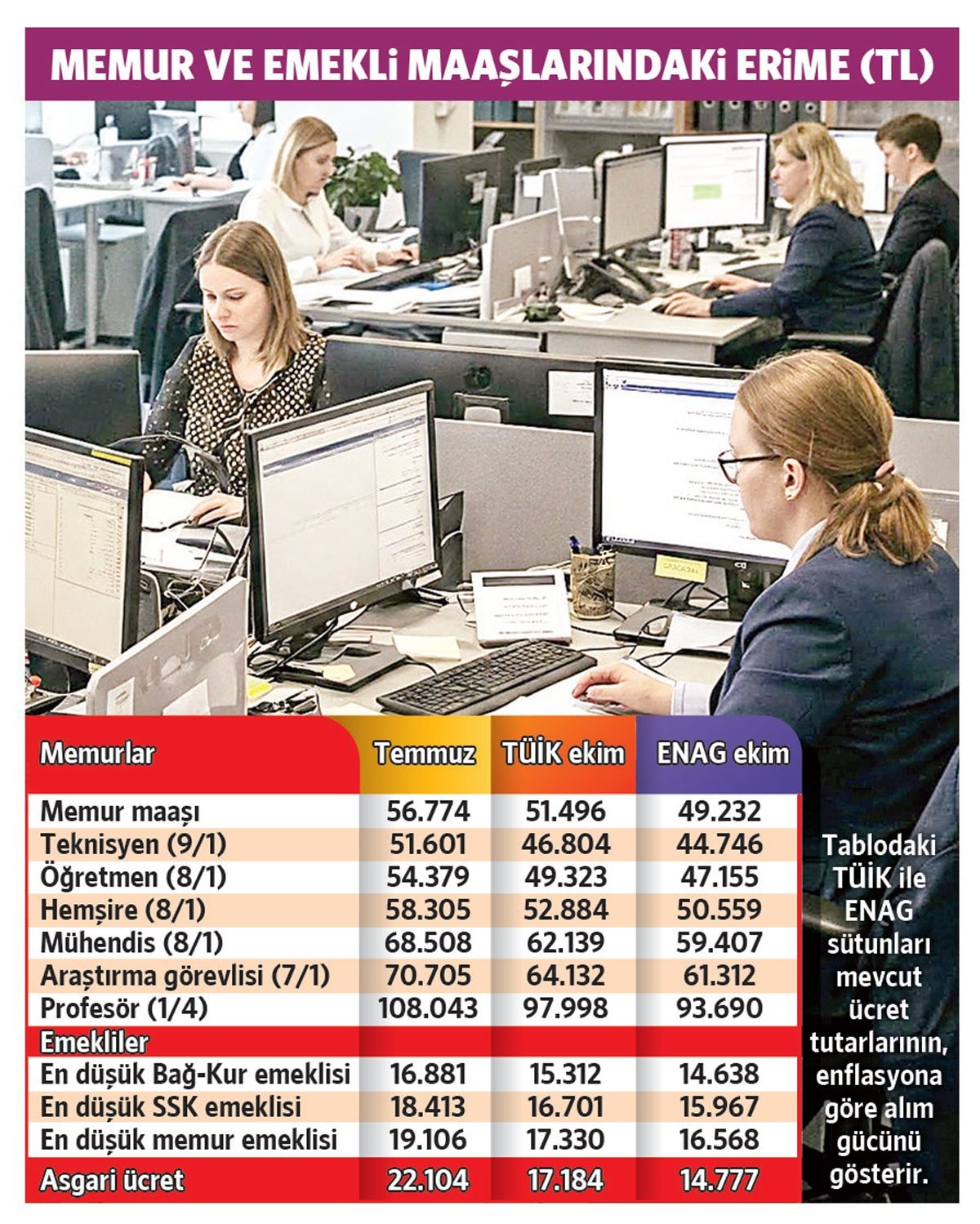 4 ay önce yapılan zamla 50 bin 503 liraya çıkarılan en düşük memur maaşının bugünkü alım gücü TÜİK enflasyonuyla 4 bin 695 lira eriyerek 45 bin 695 liraya düştü. ENAG enflasyonuyla en düşük memur maaşındaki erime 6 bin 709 liraya ulaştı, bugünkü reel alım gücünü 43 bin 794 liraya düşürdü. Öğretmen maaşı 5 bin 56 lira kayıpla 54 bin 379 liradan 49 bin 323 liraya, mühendis maaşı 6 bin 369 TL kayıpla 68 bin 508 liradan 62 bin 139 liraya geriledi.
