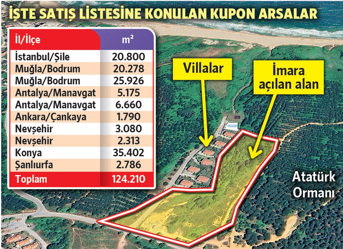 Özelleştirme İdaresi Başkanlığı, Şile’deki fiili orman alanıyla birlikte 7 kentteki toplam 124 bin 210 metrekare kamu arsa ve arazisini satışa çıkardı. Toplam 110 milyon lira geçici teminat bedeliyle satışa çıkarılan arsa ve araziler İstanbul, Ankara, Antalya, Muğla (Bodrum), Nevşehir, Konya ve Şanlıurfa’da bulunuyor. Bodrum Gökçebel’de satılacak arsa birbirine yakın 4 ayrı parselden oluşuyor. Satılacak arsaların 11 bin 835 metrekaresi Antalya’nın turistik Manavgat ilçesinde yer alıyor. Konya’daki 35 bin 402 metrekare arsa ile Ankara, Nevşehir ve Şanlıurfa’daki arsalar da bu ayın sonuna kadar satılmış olacak.