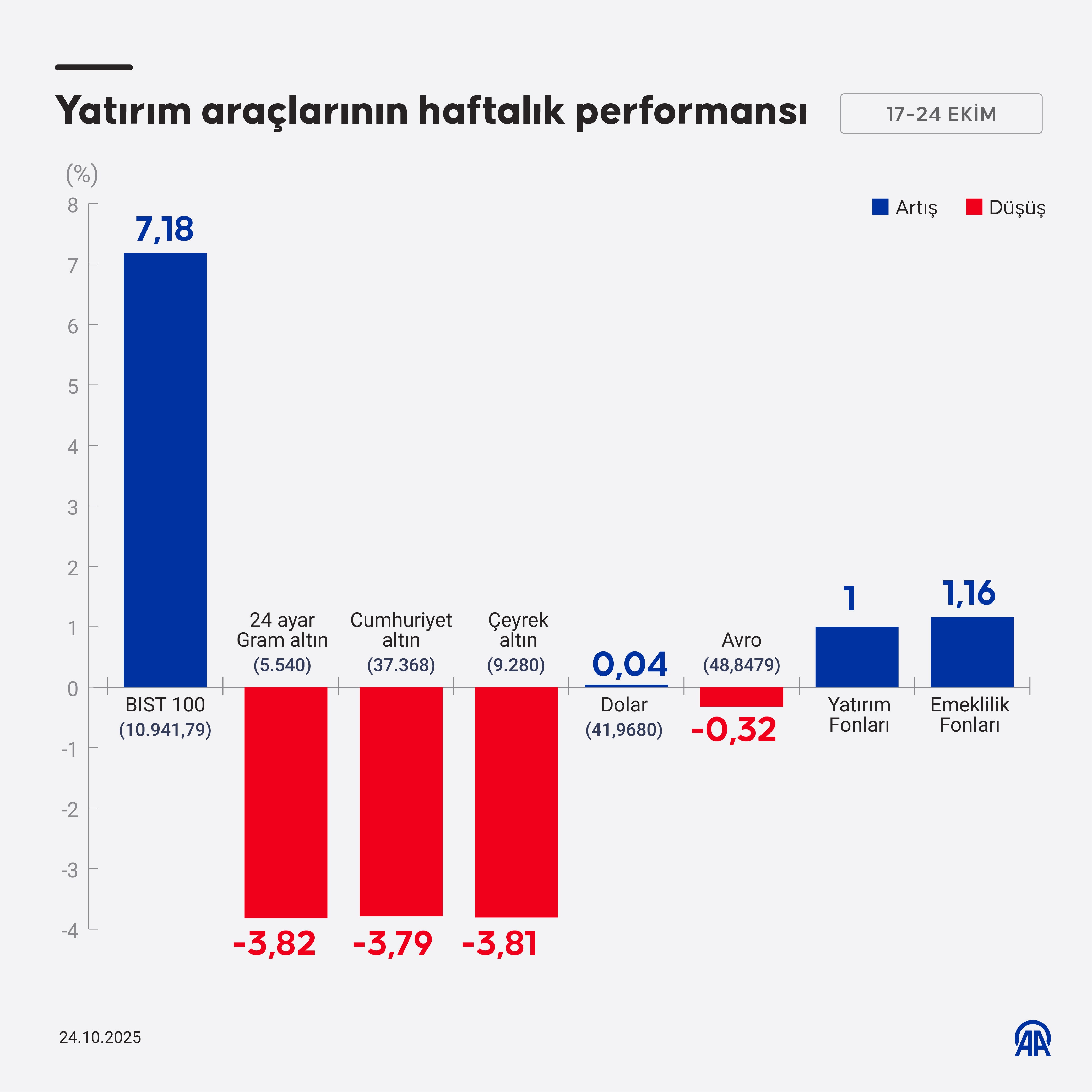 Bu hafta ABD doları yüzde 0,04 artarak 41,9680 liraya çıkarken, avro yüzde 0,32 düşerek 48,8479 liraya indi.