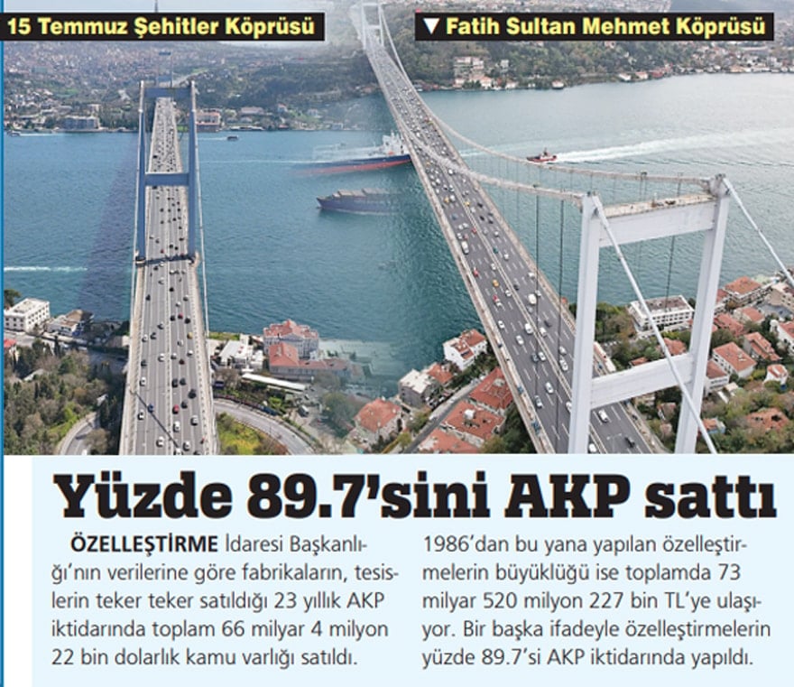 Fabrikalardan madenlere kadar katma de- ğer üreten işletmeler teker teker satılırken sıra köprü ve otoyollara kadar geldi. Ekonomist Atilla Yeşilada, bu satış için yaptığı değerlendirmede “Bir tüccarın ya da sanayicinin ala- cak senetlerini bankaya kırdırması gibi bir şey” benzetmesi yaptı.