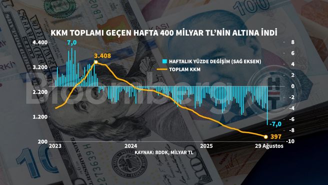 Bankacılık Düzenleme ve Denetleme Kurumu’na nazaran, Kur Muhafazalı Türk Lirası Mevduat ve Katılma Hesapları (KKM) 29 Ağustos haftasında 29 milyar 828 milyon TL azalarak, 397 milyar 297 milyon TL’ye geriledi.