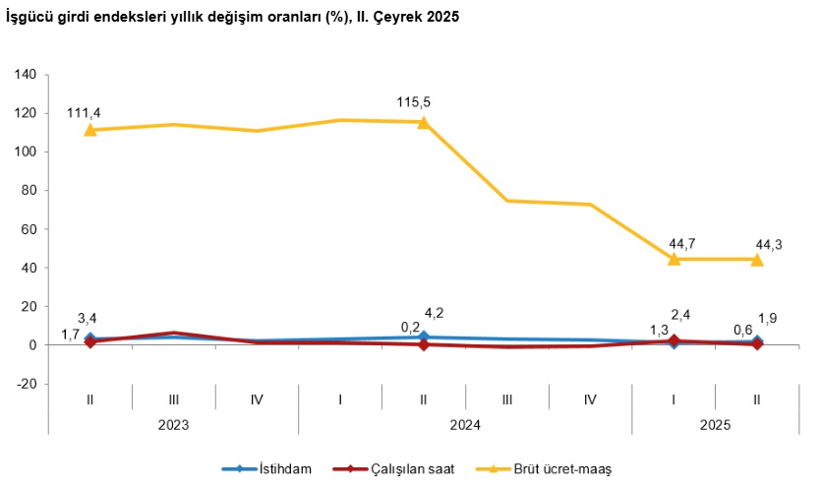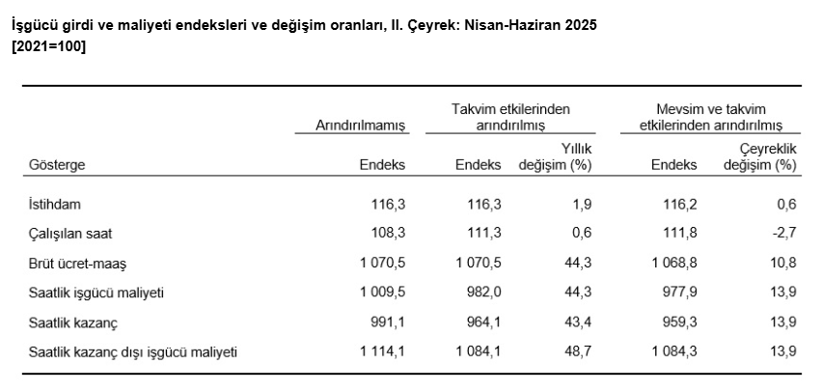 Sanayi, inşaat ve ticaret-hizmet bölümleri toplamında brüt ücret-maaş endeksi, 2025 yılı II. çeyreğinde bir evvelki yılın tıpkı çeyreğine nazaran yüzde 44,3 arttı. Alt kesimler incelendiğinde, endeks; sanayi kesiminde yüzde 38,3, inşaat dalında yüzde 47,7 ve ticaret-hizmet bölümlerinde yüzde 47,8 arttı.