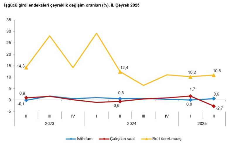 Sanayi, inşaat ve ticaret-hizmet dalları toplamında brüt ücret-maaş endeksi, 2025 yılı II. çeyreğinde bir evvelki çeyreğe nazaran yüzde 10,8 arttı. Alt kesimler incelendiğinde, endeks; sanayi bölümünde yüzde 9,9, inşaat kesiminde yüzde 12,1 ve ticaret-hizmet kesimlerinde yüzde 11,3 arttı.