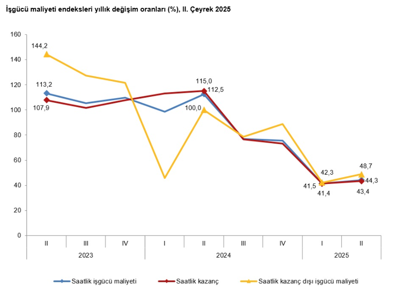 Sanayi, inşaat ve ticaret-hizmet kesimleri toplamında saatlik işgücü maliyeti endeksi, 2025 yılı II. çeyreğinde bir evvelki yılın tıpkı çeyreğine nazaran yüzdde 44,3 arttı. Alt kesimler incelendiğinde, endeks; sanayi dalında yüzde 44,6, inşaat bölümünde yüzde 42,8 ve ticaret-hizmet dallarında yüzde 45,2 arttı.