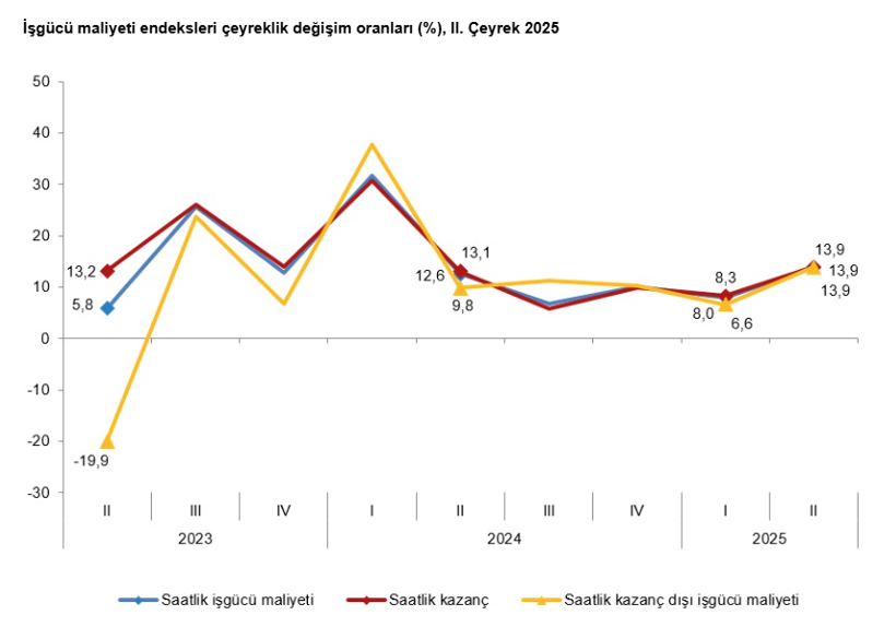 Sanayi, inşaat ve ticaret-hizmet dalları toplamında saatlik işgücü maliyeti endeksi, 2025 yılı II. çeyreğinde bir evvelki çeyreğe nazaran yüzde 13,9 arttı. Alt dallar incelendiğinde, endeks; sanayi dalında yüzde 14,8, inşaat bölümünde yüzde 14,6 ve ticaret-hizmet bölümlerinde yüzde 13,4 arttı.