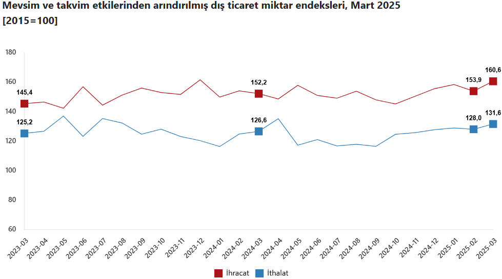Mevsim ve takvim tesirlerinden arındırılmış ihracat ölçü endeksi mart ayında yükseldi. Şubat ayında 153,9 olan endeks, mart ayında yüzde 4,4 artış göstererek 160,6 düzeyine ulaştı. Takvim tesirlerinden arındırılmış datalara nazaran ise ihracat ölçü endeksi, 2024 yılı mart ayında 162,0 iken 2025 yılı mart ayında yüzde 5,7 artarak 171,1 olarak kaydedildi.
