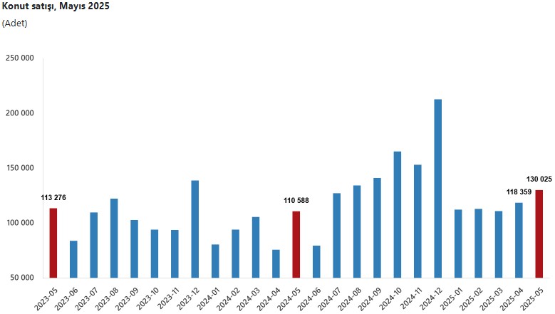 Türkiye İstatistik Kurumu (TÜİK), mayıs ayı ‘Konut Satış İstatistikleri‘ datalarını yayımladı. Buna nazaran, Türkiye genelinde mayıs ayında 130 bin 25 konut satılarak 2025 yılının en yüksek düzeyine ulaşıldı.