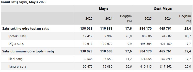 2025 yılı Ocak-Mayıs devrine bakıldığında, konut satışları geçen yılın birebir periyoduna nazaran yüzde 25,4 oranında artış göstererek 584 bin 170’e ulaştı.