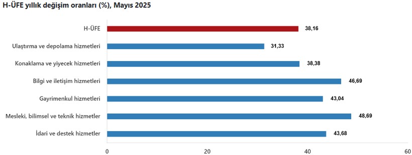 Yıllık bazda en düşük artış yüzde 31,33 ile ulaştırma ve depolama hizmetlerinde görülürken, konaklama ve yiyecek hizmetleri yüzde 38,38, bilgi ve irtibat hizmetleri yüzde 46,69, gayrimenkul hizmetleri yüzde 43,04 oranında yükseldi. Mesleksel, bilimsel ve teknik hizmetlerde yüzde 48,69, idari ve dayanak hizmetlerde ise yüzde 43,68 oranında artış kaydedildi.