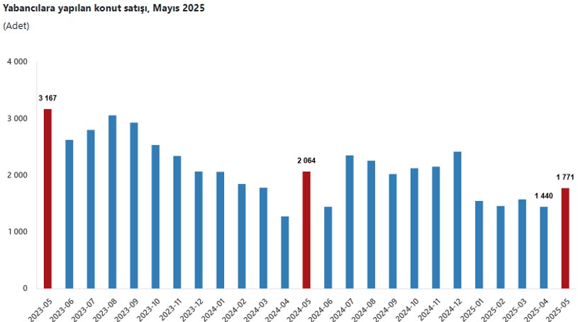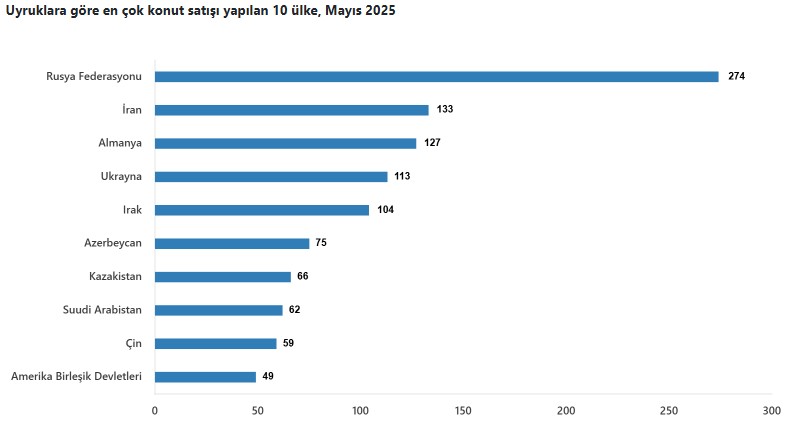 Yabancılara yapılan konut satışları Ocak-Mayıs periyodunda bir evvelki yılın birebir periyoduna nazaran yüzde 13,7 oranında azalarak 7 bin 789 oldu. Mayıs ayında ülke uyruklarına nazaran en fazla konut satışı sırasıyla 274 ile Rusya Federasyonu, 133 ile İran ve 127 ile Almanya vatandaşlarına yapıldı.