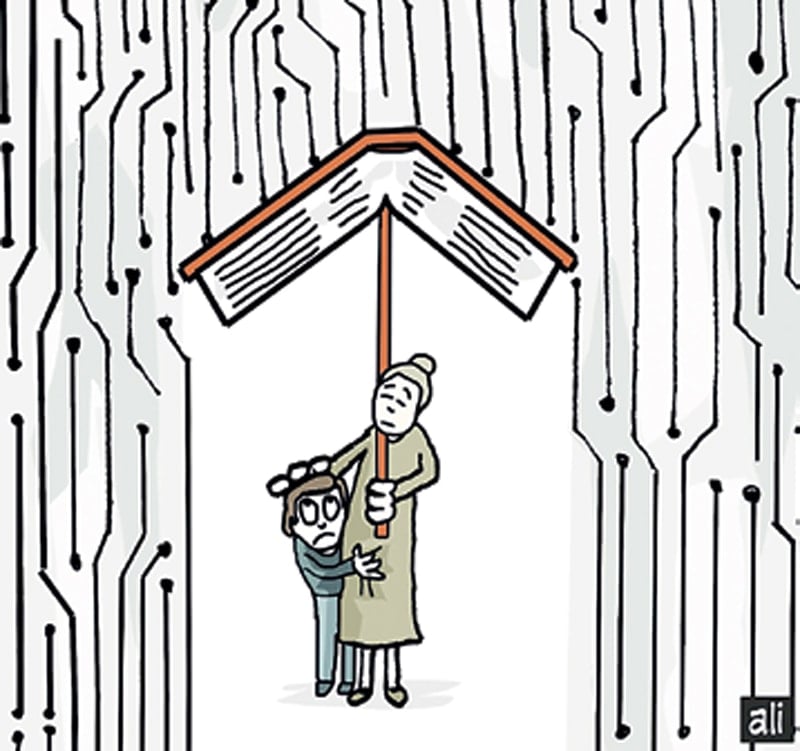 Sergideki karikatürlerde dijital sağanaklara karşı bir kitabın sunduğu güvenli liman ve yeniden keşfedilmeyi bekleyen insani ruh, sanatçıların keskin zekâsıyla geleceğe dair umut dolu birer simgeye dönüşüyor.