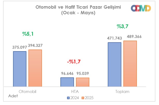 2025 Ocak-Mayıs periyodunda toplam araba ve hafif ticari araç satışları yüzde 3,7 artarak 489 bin 366 adede çıktı. Araba satışları birinci beş ayda yüzde 5,1 artışla 394 bin 327 adede ulaşırken, hafif ticari araç satışları yüzde 1,7 oranında düşerek 95 bin 39 adet olarak kaydedildi.